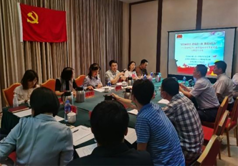 參觀后,4 個黨支部齊聚會議室,由濱海新區(qū)區(qū)委組織部高層次人才服務(wù)室黨支部書記劉建輝主持召開了座談會。宏亞公司黨支部書記岳琳領(lǐng)學(xué)了習(xí)近平總書記關(guān)于加強(qiáng)職業(yè)教育的重要指示批示精神,介紹了全國先進(jìn)地區(qū)職業(yè)教育考察情況及項目進(jìn)展情況。濱建投項管公司黨支部書記楊程交流了濱海新區(qū)黃港生態(tài)區(qū)職業(yè)教育產(chǎn)業(yè)園入園院校進(jìn)展情況,劉建輝介紹了濱海新區(qū)職業(yè)教育基地建設(shè)展望。在交流研討中,宏亞公司咨詢?nèi)坎块L高淑玲回答了大家比較關(guān)心的入園院校數(shù)量、政府政策支撐、資金平衡方式等方面的情況。