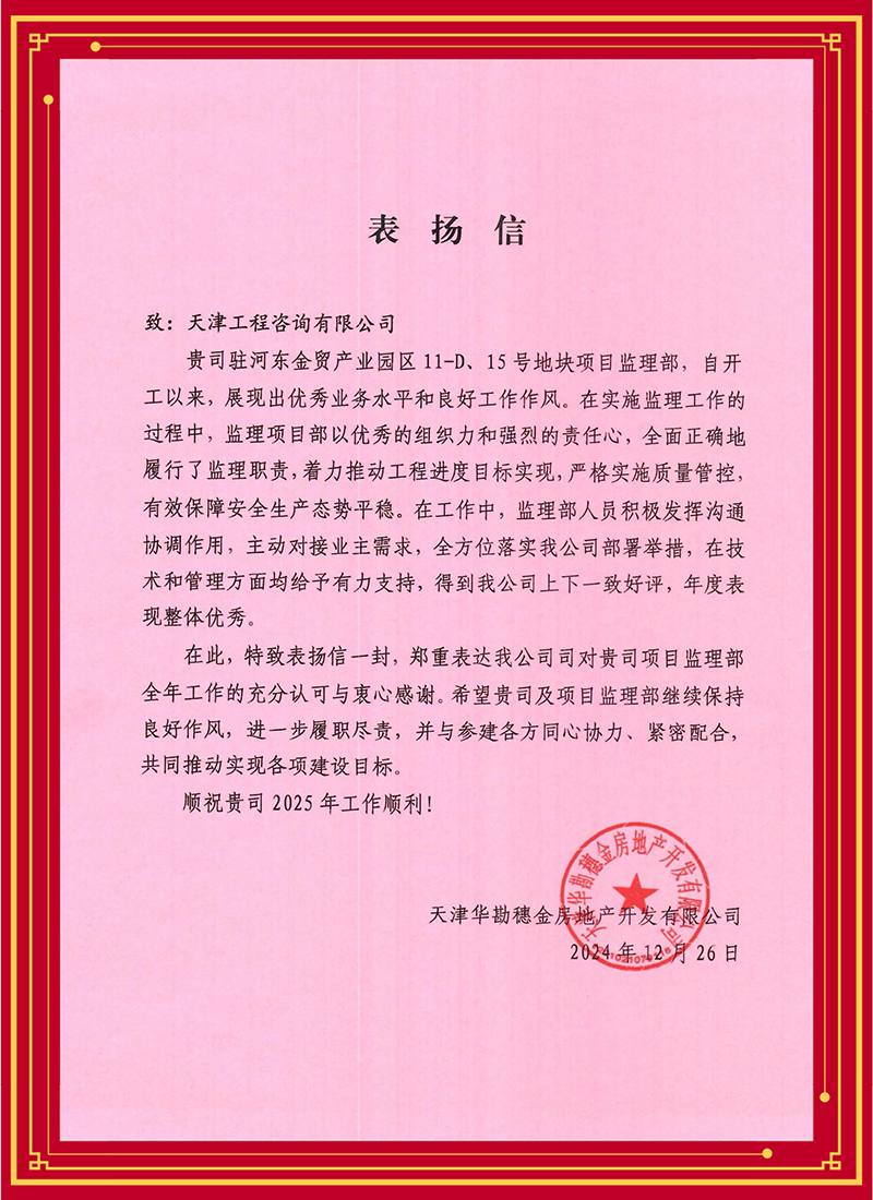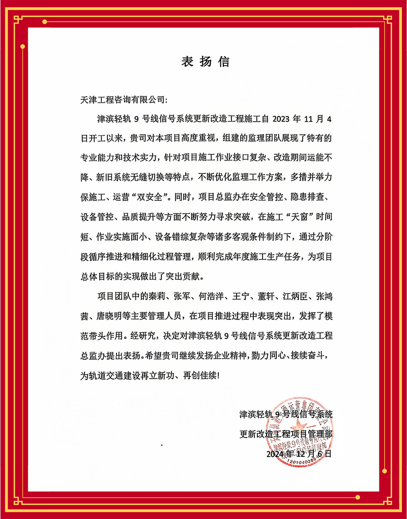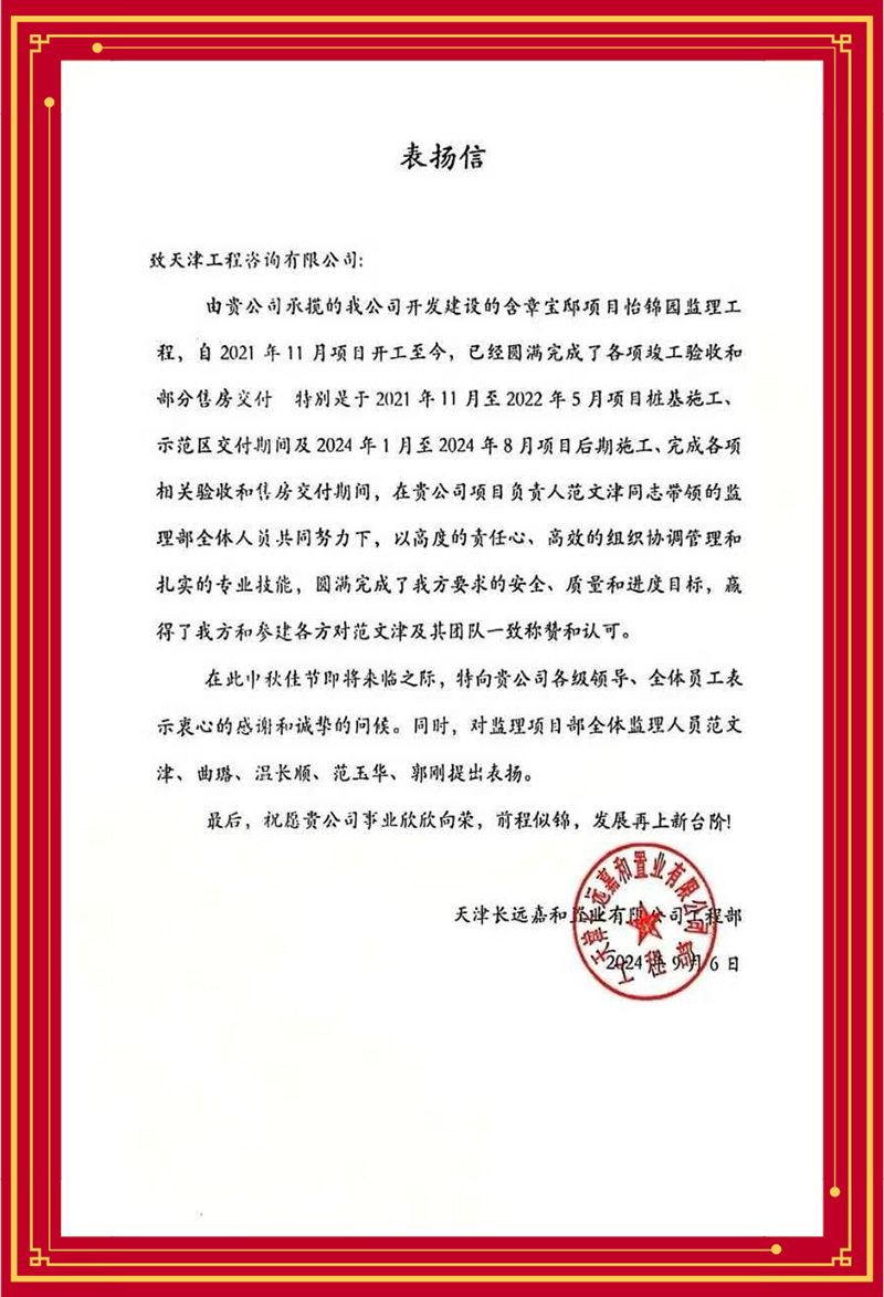 津?yàn)I輕軌9號線信號系統(tǒng)更新改造工程項(xiàng)目部感謝監(jiān)理團(tuán)隊(duì)多舉措解決項(xiàng)目施工作業(yè)接口復(fù)雜、改造期間運(yùn)能不降、新舊系統(tǒng)無縫切換等難題,力保施工、運(yùn)營“雙安全”;天津長遠(yuǎn)嘉和置業(yè)有限公司贊賞含璋寶坻項(xiàng)目怡錦園項(xiàng)目監(jiān)理團(tuán)隊(duì)以高度的責(zé)任心、高效的組織協(xié)調(diào)管理和扎實(shí)的專業(yè)技能推動項(xiàng)目圓滿完成;天津華勘穂金房地產(chǎn)開發(fā)有限公司感謝監(jiān)理項(xiàng)目部主動對接業(yè)主需求,有效管控質(zhì)量安全,切實(shí)保障施工進(jìn)度,很好地履行監(jiān)理職責(zé)......