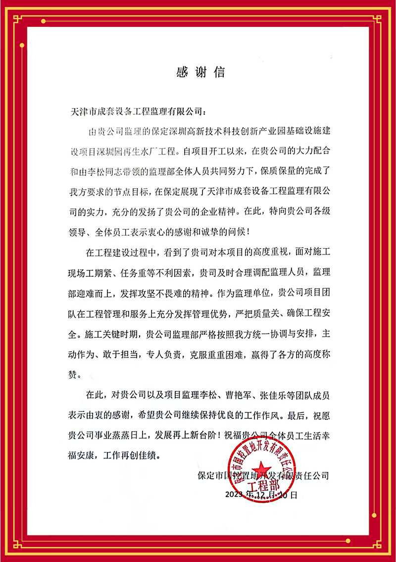2024年,為持續(xù)深化“1264”戰(zhàn)略體系特別是“六化”舉措,加快推進(jìn)實(shí)體化進(jìn)程,天津咨詢順利完成吸收合并下屬成套監(jiān)理公司,在持續(xù)打造天津咨詢品牌,以工程監(jiān)理和項(xiàng)目管理為基礎(chǔ),發(fā)揮在項(xiàng)目建設(shè)期的綜合專業(yè)優(yōu)勢,逐步形成“監(jiān)”“管”一體化服務(wù)模式方面邁出關(guān)鍵一步。近期,多家業(yè)主單位先后發(fā)來感謝信、表揚(yáng)信,對天津咨詢承擔(dān)工程建設(shè)監(jiān)理任務(wù)給予充分肯定。