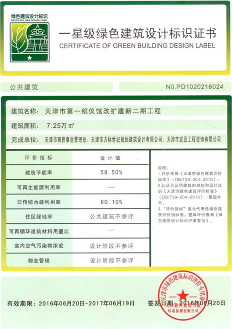 天津市第一殯儀館改擴建項目 更新時間:2021-09-14 點擊:2015 所屬欄目:社會事業(yè) 坐落在天津市北辰區(qū)鐵東路(第一殯儀館院內(nèi))??偼顿Y約3.6億元,總建筑面積7.3萬平米,地上兩層,地下一層,其中:地上5.3萬平米,地下2萬平米,框架結(jié)構(gòu),屬于天津市民心工程。該項目于2016年6月通過專家會評審,獲得國家一星級綠色建筑設(shè)計標識。 服務(wù)內(nèi)容 能評、綠建咨詢、招標代理