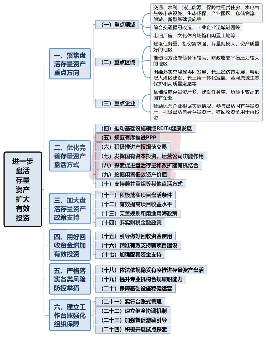 剛剛,國務院辦公廳發(fā)布《關于進一步盤活存量資產擴大有效投資的意見》(國辦發(fā)〔2022〕19號)。新規(guī)共提出24條意見,整體框架如下: